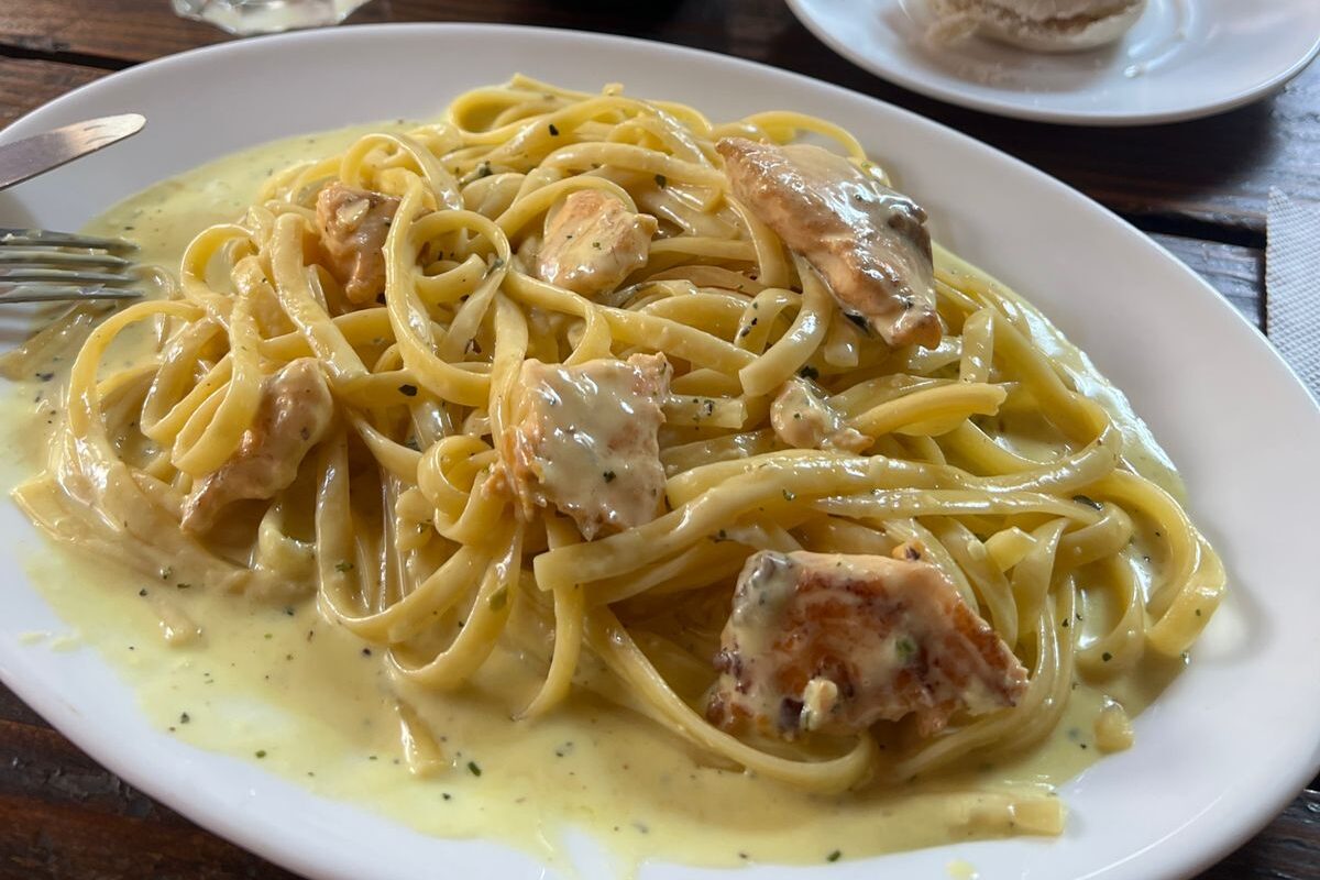 Esse aqui é pra que quer sabor, sem olhar muito o preço. Apesar de ser o preço médio de San Pedro, é caro. O menu completo com entrada, almoço e sobremesa custa 8500 pesos chilenos, cerca de 50 reais por pessoa, e só pode ser pago em dinheiro efetivo. Eu amo demais um prato em especial: o macarrão com salmão e molho branco. É incrível.