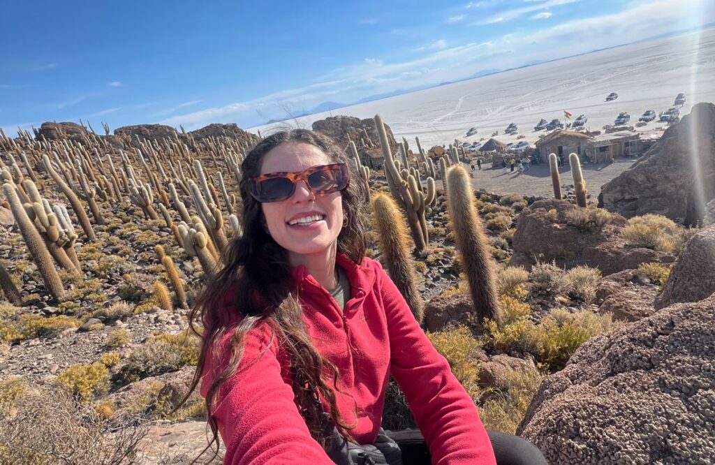 Minha primeira vez no salar foi em julho, em um tour de um dia. Estava seco e muito frio, o que tornou a visita um pouco desconfortável, mas ainda assim inesquecível. Na segunda viagem, fiz o tour de três dias começando e terminando em Uyuni, quando o salar estava coberto de água. Foi mágico ver o reflexo do céu e viver um pôr do sol espelhado, um dos mais lindos da minha vida. No entanto, fiquei chateada por não poder visitar a Isla de Cactus, que tanto gosto.
