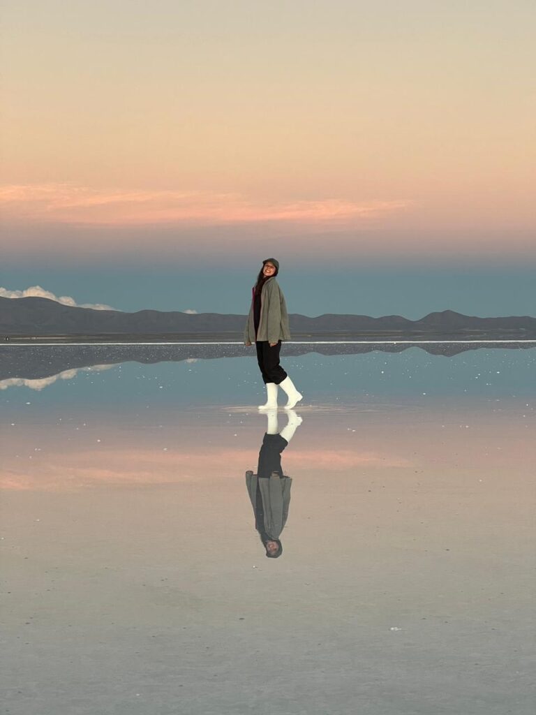 O famoso efeito espelho do Salar de Uyuni é uma das imagens mais icônicas da Bolívia. Ele acontece quando uma fina camada de água cobre o deserto de sal e reflete o céu, criando a sensação de estar caminhando em meio às nuvens. O chão desaparece e a paisagem parece infinita. É mágico porque o salar se transforma em um grande espelho natural, onde até a linha do horizonte some.